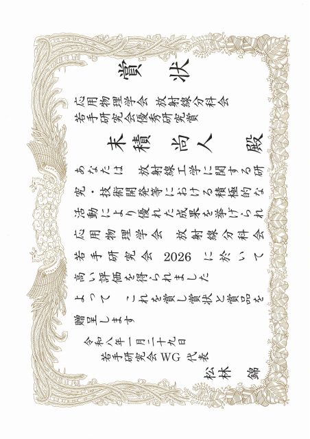 末積 尚人さん(材料システム工学専攻 吉川研究室)が応用物理学会 放射線分科会若手研究会2026において優秀研究賞を受賞しました。